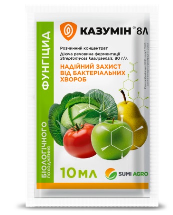 Фунгіцид Казумін 8Л – це бактерицидний фунгіцид, який має лікувальні властивості, які скорочують і знищують шкідливі бактерії, що викликають церкоспороз, антракноз, плямистість і септоріоз на плодових деревах і пасльонових культурах. Він не токсичний та безпечний для людей та тварин. Засіб виготовляють у вигляді водного розчину або суспензії.
