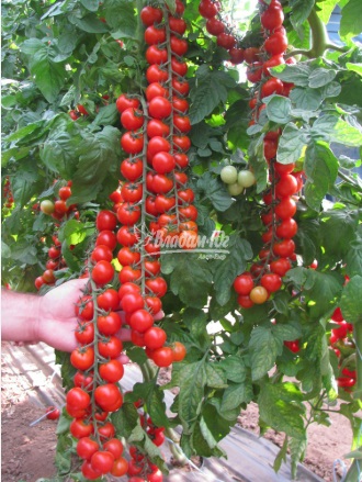 Томат Череза F1 – томат черрі . Ранній томат-коктейль. Для цільно-плідного консервування та свіжого ринку. Плоди округлої форми, вагою 20-25 г, діаметр 30-35 мм. Плоди вирівняні за формою та вагою на кисті при дозріванні. Відрізняється дружним дозріванням, 80% врожаю можна збирати протягом перших двох декад від початку дозрівання. На кисті формує 16-20 плодів. Можливе збирання кистями для свіжого ринку. Висока стійкість до стресових умов вирощування. Один із самих пластичних томатів, який легко адаптується до різних агрокліматичних умов. Високий вміст цукру та чудовий солодкий смак змушують купити його ще раз!